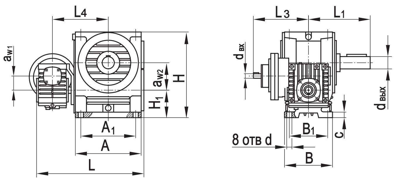 Типоразмер аW1 аW2 А А1 В В1 L* L1* L2max L3* L4 Н Н1 с d dвх dвых